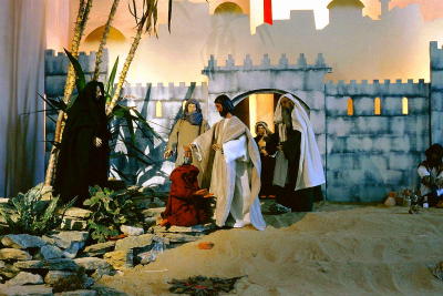 Vor den Toren der Stadt begegnet Jesus dem Blinden. Das Evangelium  Unterwegs sah Jesus einen Mann, der seit seiner Geburt blind war... Jesus spuckte er auf die Erde; dann machte er mit dem Speichel einen Teig, strich ihn dem Blinden auf die Augen und sagte zu ihm: Geh und wasch dich in dem Teich Schiloach! Schiloach heißt übersetzt: Der Gesandte. Der Mann ging fort und wusch sich. Und als er zurückkam, konnte er sehen. Die Nachbarn und andere, die ihn früher als Bettler gesehen hatten, sagten: Ist das nicht der Mann, der dasaß und bettelte? Einige sagten: Er ist es. Andere meinten: Nein, er sieht ihm nur ähnlich. Er selbst aber sagte: Ich bin es. Da brachten sie den Mann, der blind gewesen war, zu den Pharisäern. Es war aber Sabbat an dem Tag, als Jesus den Teig gemacht und ihm die Augen geöffnet hatte. Auch die Pharisäer fragten ihn, wie er sehend geworden sei. Der Mann antwortete ihnen: Er legte mir einen Teig auf die Augen; dann wusch ich mich, und jetzt kann ich sehen. Einige der Pharisäer meinten: Dieser Mensch kann nicht von Gott sein, weil er den Sabbat nicht hält. Andere aber sagten: Wie kann ein Sünder solche Zeichen tun? So entstand eine Spaltung unter ihnen. Da fragten sie den Blinden noch einmal: Was sagst du selbst über ihn? Er hat doch deine Augen geöffnet. Der Mann antwortete: Er ist ein Prophet. Sie entgegneten ihm: Du bist ganz und gar in Sünden geboren, und du willst uns belehren? Und sie stießen ihn hinaus. Jesus hörte, daß sie ihn hinausgestoßen hatten, und als er ihn traf, sagte er zu ihm: Glaubst du an den Menschensohn? Der Mann antwortete: Wer ist das, Herr? (Sag es mir,) damit ich an ihn glaube. Jesus sagte zu ihm: Du siehst ihn vor dir; er, der mit dir redet, ist es. Er aber sagte: Ich glaube, Herr! Und er warf sich vor ihm nieder. Da sprach Jesus: Um zu richten, bin ich in diese Welt gekommen: damit die Blinden sehend und die Sehenden blind werden. des Textes für uns heute ist auf den Punkt gebracht in