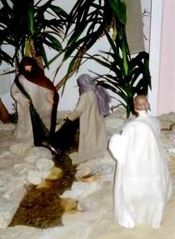vom 3. Sonntag im Jahreskreis (A)  Die Krippenszene: Genau genommen handelt es sich um eine Nebenszene zur großen Weihnachtskrippe, die bis zum 2. Februar, dem Fest der Darstellung im Tempel stehen bleibt. Unterdessen erzählen die Sonntagsevangelien bereits die ersten Geschichten des öffentlichen Lebens Jesu - z.B. die Berufung der ersten Jünger. Die "Quelle des Lebens", die am Stall zu Bethlehem entspringt, fließt hinab in die judäische Wüste und wandelt sich zum "Jordan". Dort gehen Fischer ihrem Handwerk nach. Jesus - jetzt schon ein junger Mann - nähert sich ihnen von der Stadt Jerusalem her. Er ruft die Fischer mitten aus ihrem Alltag heraus in seine Nachfolge. Während er auf den Korb mit gefangenen Fischen hinweist, eröffnet er ihnen die bei weitem größere Berufung: "Ich werde euch zu Menschenfischern machen." Diese Sendung gilt auch heute noch allen Jüngerinnen und Jüngern Jesu - nicht nur den "Hauptamtlichen". Uns allen ist es aufgetragen, Menschen für seine Botschaft zu gewinnen und zu begeistern, damit auch heute das "Reich Gottes" wächst und diese Welt mehr und mehr verwandelt in eine menschliche Welt. |