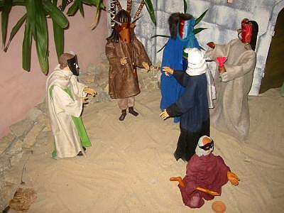 lleven máscaras –salvo uno: lateralmente entra Jesús –sin