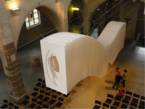 determina un espacio! Ninguna de estas grandes curvaturas de papel se parece a otra. Cada una está configurada de forma única mediante una técnica especial de rasgado. Y, sin embargo, las une algo: Más o menos en el centro de cada curvatura la artista ha hecho “agujeros” grandes, más pequeños y de forma muy diferente. Las curvaturas están alienadas de forma tupida unas tras otras y, de este modo, se genera algo así como un espacio interior semejante a una cueva, más exactamente una especie de “túnel”. Para nosotros es familiar el modismo “luz al final del túnel” como expresión de nuestra esperanza, que incluso entonces no muere, aunque todavía no se pueda ver aquella luz a consecuencia de las curvas del túnel. Pero, en este caso, el propio túnel no es obscuro, ya que la escultura en conjunto a consecuencia de su material y también a consecuencia de la equidistancia entre los pliegos de papel es permeable a la luz. Así se genera una especie de luz difusa, que le da al espacio interior del “túnel” un carácter muy peculiar. . Tomemos el camino a través del túnel como un símbolo para nuestra vida. Entonces éste no es sólo iluminado desde la meta, por consiguiente, desde “la luz al final del túnel”. Más bien se podría interpretar que este camino está iluminado de forma muy propia por la luz de la gracia de Dios que nos acompaña. Expresado de otra forma – Dios mismo es por antonomasia la Luz, que está con nosotros en el camino – aunque nosotros no podamos “agarrar” Su presencia en experiencias concretas. Acto seguido caigo en la cuenta de que este agitado camino de arriba a abajo por la cueva de papel conduce a la postre “hacia arriba” y va a parar finalmente a la vidriera del coro de la Crucifixión de Cristo. Así se aclara al creyente, como mínimo, por donde se proporciona la luz al final del túnel: por Cristo crucificado y resucitado. Se podría llegar a una interpretación muy diferente del “túnel”, si uno se coloca en la cabecera de la escultura, con la vista puesta en la entrada del túnel. De esta forma da la impresión de una oreja. Así puede surgir el pensamiento de un conducto auditivo. Entonces yo quisiera escuchar el mensaje que se puede oír aquí. ¿Quizás es de nuevo el mensaje curativo de la Cruz de la vidriera del coro? Naturalmente me llama la atención – quizás en primer lugar – la ligereza de la instalación suspendida en el espacio. Ciertamente actúa en contraste con las “pesadas” columnas y bóvedas, incluso en una iglesia gótica. Esta figura en apariencia tan sumamente ligera y, al mismo tiempo, vibrante, además parece estar en movimiento, lo cual es incluso verdad si le da un soplo de viento. De nuevo este “movimiento” actúa en contraste, de modo comparativo, con la estática inmóvil de la arquitectura. ¿Verdaderamente no gana nuestra vida una cierta ligereza, cuando estamos convencidos por la fe de que ¡Dios está aquí! ¡Él está aquí por mí! Él me lleva cuando mi camino se hace difícil. ¿Y no se convierte esta ligereza en una ligereza sublime cuando nos dejamos tocar por el “hálito del Espíritu”? Todavía una última asociación: Esta escultura que se balancea – podría ser un acordeón tocado dinámicamente por una mano invisible. Ligereza y alegría dinámica puede también caracterizar la música que él crea. Merece la pena escuchar esta música en el silencio de la Iglesia. Cada uno puede percibirla de forma diferente – quizás incluso como música esférica o “celestial”. Está totalmente permitido, dirigir al mismo tiempo una mirada a la patrona de la música eclesial, Santa Cecilia, que está representada debajo con un pequeño órgano en la vidriera de la Crucifixión. Así se realizaría una conexión entre dos elementos que son muy importantes para Sankt Peter: arte y música. Ambos al servicio del mensaje del Evangelio, y ambos como impulso para una respuesta orante a este mensaje.