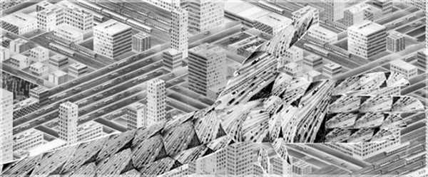 in eine modrerne Großstadt hineinkomponiert, die sich