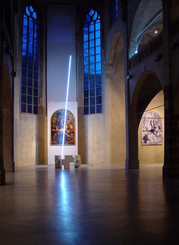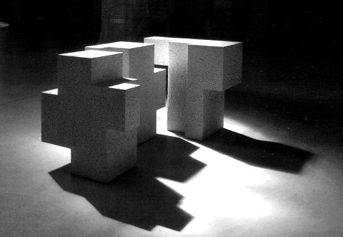 (Hans-A. Hüsgen).  Gurutz Aldare/Altar Cruz (1967/2000) Granito 100,5 x 201 x 99 cm Sankt Peter, Colonia Los altares de Cruz son una antigua tradición en la arquitectura eclesial. En el doble coro de las iglesias de las catedrales y monasterios de la temprana Edad Media se hallaba el altar con el título de la Santa Cruz (s. crucis) en el centro geométrico del espacio, en el punto de intersección del eje longitudinal y transversal y simbolizaba así el significado central de la Cruz de Cristo en la historia. La iglesia de Sankt Peter, del gótico tardío, no tiene ninguna nave transversal pero, sin embargo, el “lugar de la Cruz” está indicado: Los brazos laterales del coro alto dejan libre el último travesaño antes del ábside. Ciertamente el altar de Cruz de Chillida señaló durante un breve tiempo este “lugar de la Cruz” y le dio un centro al amplio y vacío espacio. El altar convertía el espacio de la iglesia en espacio de Cruz. Los tres elementos cruciformes del altar daban al lugar un simbólico peralte además de un nombre: “Golgota”.  Para el Gurutz Aldare fue cortado en tres partes un enorme bloque de granito. Todas representan una Cruz, unas dentro de otras y separadas capturan el espacio, y crean un espacio interior accesible, en el que el sacerdote entra en la parte más elevada de la ceremonia sagrada y celebra el sacramento del altar instituido por Cristo. El propio Cristo entra en el espacio del altar en forma de Pan y Vino y en el espacio creyente de los celebrantes. Así se hace experimentable en el acontecer dinámico de la ceremonia sagrada la unidad de Cristo del mismo modo que el propio altar de Cruz en su excitante unidad de masa y vacío, tiene que ser visto como una parte única y representa, según la antigua tradición, al Cristo único. En la visión de conjunto del altar de Cruz y del antiguo retablo de la “Crucifixión de Pedro”, reconocemos el camino de la Cruz como el seguimiento de la Cruz. El camino del seguimiento de la Cruz conduce, en el cuadro de Rubens, al cielo abierto por medio de la Cruz. Entretanto han retornado a S. Peter las originales vidrieras del Renacimiento. En el centro sobre este altar, cuando todavía estaba allí: La gran vidriera de la Crucifixión que ve como unidad el Viernes Santo y la mañana de Pascua.  El altar de Cruz y la vidriera de Cruz harían referencia el uno a la otra y al espacio vacío, en el que nada aparta de lo esencial, dando un testimonio del centro pascual de nuestra fe: “Jesucristo – crucificado, muerto y sepultado, descendió a los infiernos y al tercer día resucitó de entre los muertos.” Mi mirada vaga hoy un poco triste desde el “Gurutz Aldare” en la nave lateral hasta la vidriera del coro pascualmente iluminada y proporciona aún un presentimiento del magnífico concepto integrador, que Eduardo Chillida aunó con su donación a Sankt Peter. P. Heribert S.J. según propuesta del P. Friedhelm Mennekes S.J. (lengua alemana) y Hans-A. Hüsgen (lengua alemana) |