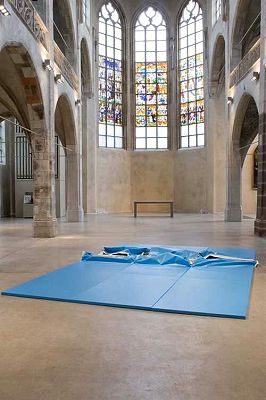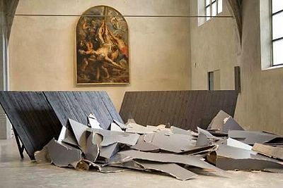 Komposition spontan zur Interpretation heraus.  Es liegt auf der Hand, die "Risse" und Verwerfungen im eigenen Leben zu assoziieren und betrachtend zu reflektieren: Die Aufstiege, Abstürze und Bruchkanten der eigenen Entwicklung; die Verletzungen und das Scheitern so mancher Beziehung; die enttäuschten Hoffnungen beruflicher Perspektiven; so manchen "Karriere-Knick"; und auch die Gebrochenheiten und Zweifel , ja Verzweiflungen im Glauben. Auch mag einem in den Sinn kommen, wie sehr wir doch uns selbst und andere messen an glänzenden Fassaden und an der Perfektion von Leistung und Selbstdarstellung. Wer hat nicht schon die Erfahrung gemacht, wie schnell und unerwartet der äußere Schein "Risse" bekommt. Aus der Sicht ignatianischer Spiritualität könnte man sich erinnert fühlen an die "Erste Woche" der Exerzitien, in der es genau darum geht, diese "Risse" der Barmherzigkeit Gottes hinzuhalten und "von Gott, unserem Herrn, die Gnade (zu) erbitten dazu hin, daß alle meine Absichten, Handlungen und Beschäftigungen rein im Dienst und in der Verherrlichung Seiner Göttlichen Majestät geordnet seien". (EB 46). Vermutlich werden nicht wenige Betrachter der Installation im Zentrum des Kirchenraumes an die Kirche Jesu Christi selbst denken: An deren vielfältige Risse und Spaltungen im Laufe ihrer Geschichte; an die vielen Verletzungen, die der Kirche von außen zugefügt wurden und werden; aber auch an die glänzende Fassade, um die auch diese Kirche immer wieder bemüht ist, und an die inneren Widersprüche, die die äußere Fassade nicht selten aufreißen und manchmal wie ein Geschwür nach außen sichtbar werden: "ecclesia semper reformanda". Wer aufmerksam seine Blicke durch Sankt Peter schweifen läßt, wird sogar in diesem scheinbar so harmonischen Kirchenraum Anhaltspunkte für eine solch kritische Betrachtung von Kirche entdecken - etwa in antisemitischen Motiven der im Krieg erhalten gebliebenen Gewölbefresken des rechten Seitenschiffes. Wer sich als gläubiger Christ jedoch anregen läßt zu einer betenden Betrachtung angesichts der Herausforderung dieser Wickeroth-Installation, wird wohl noch einen Schritt weitergehen und sich selbst als Teil der zerrisenen Kirche Jesu Christi sehen und in einem abschließenden "Vater unser" sehr nachdenklich hängenbleiben an den Bitten "Dein Reich komme", "Vergib uns unsere Schuld" und "Erlöse uns von dem Bösen". Dos instalaciones de Sebastian Wickeroth Enero/Febrero 2009 en Sankt Peter, Colonia  En el anuncio de la exposición de Wickeroth en Sankt Peter se habla de la “Estética del Fracaso”. Kai Kullen, portavoz del Consejo de Arte de Sankt Peter, habla en una aportación introductoria en la hoja parroquial (02/09) de que el artista comprende “lo destruido como momento estético equivalente junto al de la perfección y al de la curación”. Pero, al mismo tiempo, dijo el propio Sebastian Wickeroth en la conferencia de prensa de la inauguración de la exposición que él ha puesto muy conscientemente en relación la escultura-rotura con la pintura de Rubens “La Crucifixión de Pedro”. En sentido teórico artístico se puede dar un sentido a la estética de las dos obras. Pero como mínimo Pedro Pablo Rubens rehusaría estrictamente el denominar su pintura “estética” en el sentido corriente, es decir, “hermosa, de buen gusto, expresiva”. Rubens pinta en un contexto bíblico. Él sabe no sólo que lo destruido por la violencia, destruye más aún la humanidad de los autores que la vida de las víctimas. Él sabe también de la rebelión contra Dios, que se oculta en cada todo acto de violencia – empezando por Caín, el asesino fraterno, hasta aquellos asesinos que crucificaron a Jesús y también llevaron a Pedro a la Cruz y después de él condujeron a innumerables mártires cruelmente torturados de la vida a la muerte. Violencia es, por así decirlo, el “misterio de iniquidad” y domina aparentemente la historia de la humanidad e incluso la tradición bíblica. Así arrastra a la profundidad realmente toda la cruel escena de la “Crucifixión de Pedro”. En la combinación actual de la pintura de Rubens con la instalación de Rotura las tablas negras colocadas oblicuamente actúan como una bajada de escombros que acarrea para el transporte al montón de basuras la totalidad de escombros de la violencia humana como en una demolición de un edificio. Por medio de esta interpretación de Rubens queda claro, que la caída en la profundidad necesita urgentemente como equivalente lo floreciente de la arquitectura gótica eclesial. En un museo o en una galería la “rotura” comunicaría el “fin” definitivo, sería expresión de una depresiva falta de esperanza. Pero en esta Iglesia y en la contemplación conjunta con la imagen de Rubens acuñada por la fe, la composición remite a aquella “salvación”, que abre el “cielo arriba” al “mundo caído”. Así nosotros podemos hallar ánimo – incluso delante de la rotura– como personas derrotadas, decepcionadas o incluso “rotas”, si dirigimos nuestra mirada a la composición completa de “Rotura”, “Crucifixión de Pedro” y espacio eclesial gótico. Nota: sobre esta instalación tratan también dos homilías – la del 18 de Enero de 2009 y la del 25 de Enero de 2009. “Sin título” denomina Sebastian Wickeroth a las instalaciones bastante frecuentes que ha creado del mismo modo que otra para la exposición en Sankt Peter:  Se despliega espaciosamente en la nave central de la Iglesia. Una superficie estructurada también de forma rectangular. Sobre un marco plano de madera, lino estirado, liso y sin defecto. En un azul luminoso-frío, lacado en mate brillante. También aquí se tematiza la destrucción violenta. Un violento desgarrón atraviesa de un extremo a otro la aparentemente inmaculada superficie. Así se organiza de nuevo una enorme tensión entre esta destruida instalación y la armonía del espacio eclesial vacío, silencioso y m