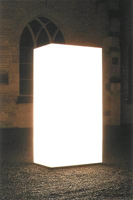 beherrscht ist. So auch in Sankt Peter: Die dunkle Kirche war sozusagen "eingespannt" zwischen dem "lebendigen" Osterfeuer zu Beginn der Liturgie auf dem Cäcilienhof nördlich der Kirche und dem gleißend weißen Licht des "Monolith" von Simon Ungers auf dem südlich gelegenen Kirchhof (ehemaliger Friedhof) von Sankt Peter. Die Vernissage der Ausstellung dieses Lichtquaders beschloß die Feier der Osternacht.