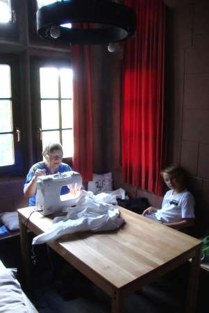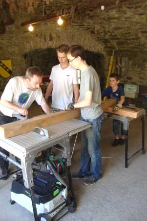 ![]() Und anschließend geht's unter blauem Himmel an die Arbeit: ![]() Für den Klettergarten muß ein Weg geschaffen werden. ![]() Auf dem Burghof gilt es, eine Treppe zu sanieren. ![]() Tische aus dem Speisesaal werden geschliffen. ![]() Material für verschiedene Holzarbeiten wir zugeschnitten. ![]() Und last not least werden ein Altartuch für die Burgkapelle und Gardinen für verschiedene Räume genäht. ![]() Viele ließen den Tag dann auklingen am Lagerfeuer - heute mit Flöten-, Geigen- und Guitarrenmusik. |