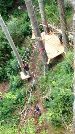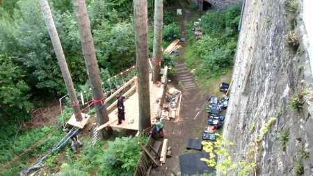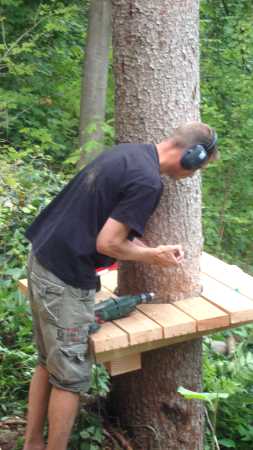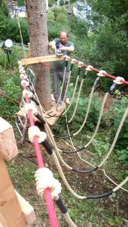 spiegeln kann:![]() Das Geländer der neuen Treppe hinauf auf die erste Ebene der Basttionen ist auf einem guten Weg und wird sicher morgen fertig: ![]() Hart gearbeitet wird morgen auf jeden Fall noch am Klettergarten. Eine erste Seilbrücke von Baum zu Baum ist bereits weit gediehen. Vielleihct kommen noch ein oder zwei Brücken dieser Art hinzu. ![]() Allerdings dürfen wir nur im unteren Bereich arbeiten. Aus Sicherheitsgründen müssen die Arbeiten oben hoch in den Bäumen an entsprechend qualifizierte Firmen in Auftrag gegeben werden. Nach dem Abendgebet hatte dann unser Chefkoch Volker wie an jedem Tag das Abendessen für alle fertig. Und das schmeckte dann auch. ![]() |