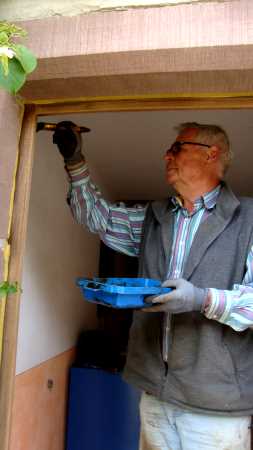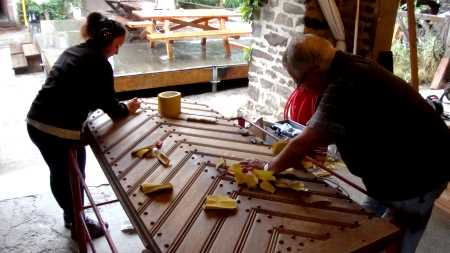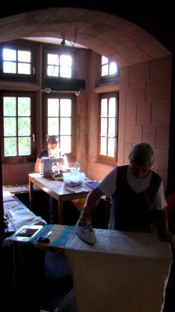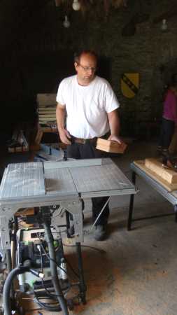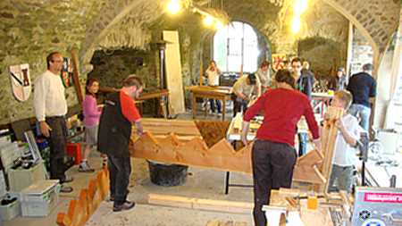 ![]() Der Zaun entlang des steil abfallenden Hanges an der Zufahrtsstraße zur Burg ist schon weitgehend ausgebessert und teilweise erneuert. Hier werden Längsbretter wetterfest lasiert. Die Arbeit an den handgearbeiteten Außentüren, die auf den Burghof führen - z.B. von der Küche und von der Burgkapelle - macht schtlich Fortschritte: ![]() Diese Tür wird noch abgeschliffen, ![]() während diese bereits einen ersten Lackanstrich erhält. Leider verzögerte am Nachmittag kräftiger Regen alle Außenarbeiten. Dafür ging's drinnen in den Burggewölben, die zur Werkstatt umfunktilniert wurden, um so betriebsamer zu: ![]() ![]() |