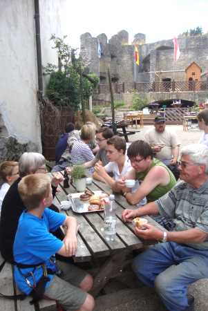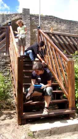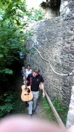 ![]() Türrahmen werden lackiert... Gleichzeitig werrden die teils sehr steilen Hangwege, die den Burgvorhof, den Spielplatz und den Abenteuer-Parcour miteinander verbinden, durch Hanfseile gesichert: Die Wege werden schließlich zu Kletterpfaden, die zunächst an der Nordmauer entlangführen... ![]() ![]() Unterdessen haben wir Gäste vom Südwestfunk. Die werden über Ora et Labora berichten und nehmen dafür Interviews auf. Am Nachmittag ruht dann mal die Arbeit. Ziel eines Halbtagesausfluges ist Trier, wo uns eine spannende Führung über den "Teufel in Trier" erwartet. Die Abendmesse zum Festtag "Mariä Himmelfahrt" in der Burgkapelle setzt dazu einen kräftigen Gegenakzent. Und noch später am Abend klingt der Tag aus mit anregenden Gesprächen in kleinen Gruppen - nicht nur am Feuer, wo der Fotograf Svenja Kormann traf, die Bundesleiterin der KSJ, die während der letzten Tage von O&L auf der Burg mitarbeiten und mitleben wird. ![]() |
