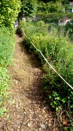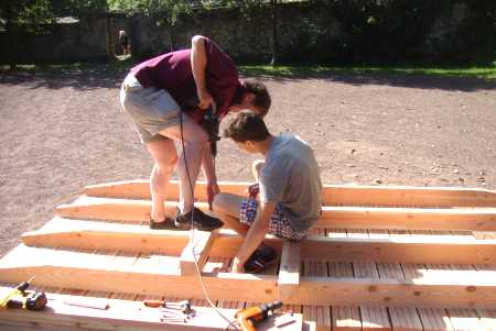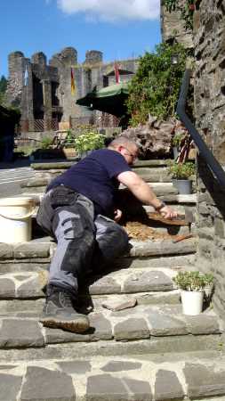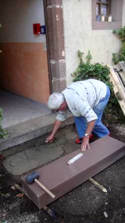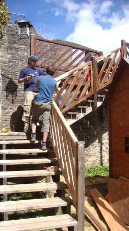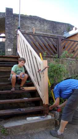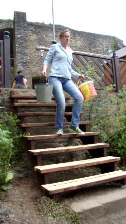 ![]() ![]() Das Projekt 'Torwand' unserer Neuerburger Freunde findet seinen Abschluß - eine der Ergänzungen des alten Spielplatzes: ![]() Auf dem Weg finden wir Kinder damit beschäftigt, Regenabflüsse zu säubern. ![]() Sozusagen im Gegenzug zur guten Versorgung ist Ulrich damit beschäftigt, die Treppe zum Kastellanhaus, der Wohnung der Burgeltern auszubessern: ![]() ![]() Beim Kiestragen konnte schon die neue Treppe benutzt werden, obwohl die noch nicht ganz fertig ist. Nachmittags wird sie jedenfalls schon mal angestrichen. Jezt fehlt nur noch das Geländer: ![]() |