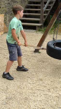 und größere Projekte sind abgeschlossen. Etliche Lichtkabel sind neu verlegt, die Feuermelder überprüft, der Brunnen gereinigt. Aber auch alle neu lackieren Fenster und Türen sind wieder an ihrem Platz. Das Werkstatt-Tor wurde ebenfalls heute fertig gestrichen: Die neuen Vorhänge im Rittersaal hängen, neue und frisch aufgearbeitete Altarwäsche liegt gewaschen und gebügelt im Schrank. Der Spielplatz lädt ein mit drei neuen Attraktionen: Wippe für Kindergruppen: ![]() Zielwand für Bogenschießen (kein Foto) und Torwand: ![]() Das Läuten zum Abendgebet wurde heute hier und da kommentiert "Jetzt schon??? Wir möchten doch dieses oder jenes noch abschließen." ![]() |