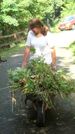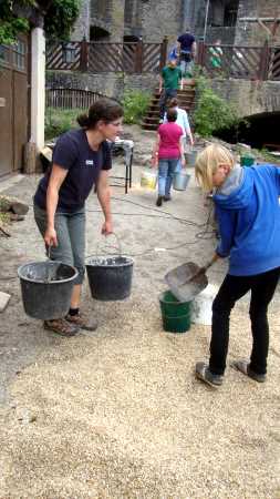 bereits Wochenmitte ist, müssen die Projekte so langsam fertig werden. Also: Auf geht's! ![]() Das Podest für den Klettergarten zwischen den Fichten, die um des Blicks auf die Burg willen weichen mußten. ![]() Rund um den Spielplatz und auf dem Burghof kümmern sich einige um den grünen Wildwuchs. ![]() Sonja sorgt unterdessen fürs Mittagessen: ![]() Inzwischen wurde Kies für die 1. Ebene der Bastion angeliefert. Der muß verarbeitet werden: ![]() ![]() |