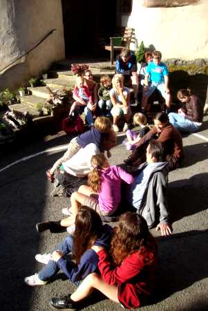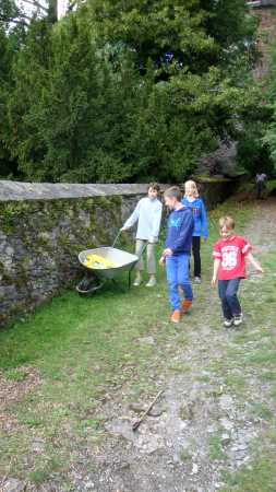 ![]() Nach dem 'Morgenlob' in der Burgkapelle: Das erse gemeinsame Frühstück. ![]() Da geht's um einen Klettergarten, der entstehen soll. (Der gab auch die Idee zum Ora-Rahmenthema "Abenteuer". ![]() Und auch ein Mauerdurchbruch ist erforderlich. ![]() Anderswo werden Zäune repariert. ![]() ![]() Zum Ende des Arbeitstages versammelt sich die Gruppe in der Burgkapelle zum Abendgebet. ![]() |