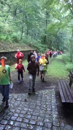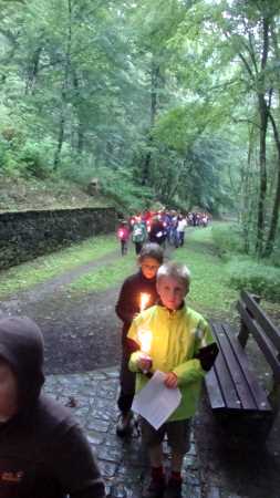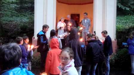 Heute bekam die Ora-et-Labora-Gruppe tatkräftige Untertützung von etlichen Neuerburger Bürgern, u.a. vom ehemaligen Bürgermeister der Stadt, der heute Vorsitzender des Neuerburger Fördervereins der Burg ist. Diese engagierten Menschen trugen zur Erweiterung des Spielplatzes unter der Burg bei mit einer Holzwand, auf die mit Pfeil und Bogen geschossen werden kann, sowie mit einer ebenfalls selbst gebauten hölzernen Torwand. Beide Eigenkonstruktionen wurden von den handwerklich qualifizierten Freunden der Burg eigenhändig auf dem Platz aufgebaut. Im Bild die Torwand mit ihren Konstrukteuren: ![]() ![]() Am Ende des Tages schließt sich an den Tagesrückblick und das Abendgebet noch ein kleiner Pilgerweg zum 'Schwarzbildchen' an. ![]() ![]() |
