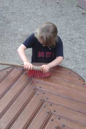 Tag, an dem fast überall letzte Hand angelegt wird:![]() z.B. an den langen Zaun der Burgzufahrt, ![]() oder an die neu Treppe zur 'Ebene 1', ![]() oder an das neue Geländer der Treppe zur Ebene 2, der 'Sonnenterasse'. Ja, und dann folgt der obligatorische gemeinsame Rundgang zur 'Begutachtung' aller 28 (!) Projekte dieses Jahres. Der O&L-Blog zählt (nahezu) alle auf: Fenster in der dritten Etage neu gemacht, Risse in der Decke des Schlafsaales 5 + 6 weggespachtelt und die Decke neu gestrichen, elektrische Leitungen verlegt, Vorhangstangen mit hübsch-beigen Gardinen belastet, Tische wie die Weltmmeisterinnen abgeschmirgelt und neu lackiert, einen Kletterparcours mit fünf Stationen, inkl. Wippe, gewuppt, ein unbefugtes Klettergartenbetretungsverhindungseingangstor in die untere Burgmauer gebrochen, den Zaun unterhalb der Burg neu gesetzt und angestrichen, dabei einen Tierzoo aus Holz gefunden und aufgestellt, den Burgbrunnen von Algen befreit, die Treppe zur Grillhütte verstärkt, dafür die Treppe zur 1. Ebene kaputtgeschlagen und eine neue Aufstiegsmöglichkeit geschaffen mit den Geländerelementen im Briechle-Stil, davon zehn vor der Sonnenterrasse gesetzt, die Treppe zur Sonnenterasse mit neuen Geländern versehen, unzählige Kieseimer neben dem Sandkasten ausgeleert in der Gewissheit das sich Stein für Stein langsam zum Burghof bewegen und dort versammeln wird und alle Türen von der Kapelle bis zur Garage geschliffen und lackiert und schließlich mehr oder weniger zaghaft Unkraut gezupft, dann alles weggeräumt, verstaut, Berge von Sägemehl zusammengefegt, und schließlich zum abschließenden Grillabend. Mit einem richtig sauberen Gefühl. ![]() an die zwanzig Tische geschliffen und lackiert, ![]() Kletterleiste mit Halteseil zum Klettergarten, ![]() zwischendurch ein Blick vom neuen Hangweg auf den Spielplatz, ![]() und last not least eines der Projekte unserer Kinder: ein gebürsteter, vom Sand befreiter, sauberer Brunnen im Burghof. |