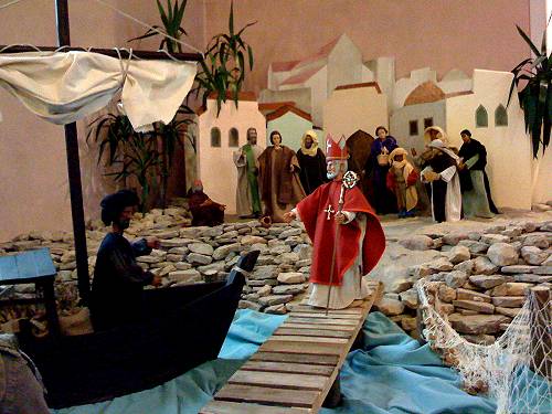 | y la milagrosa multiplicación del trigo  La Leyenda: Hace mucho tiempo, cuando San Nicolás era Obispo de Myra, hubo en todo el país una gran necesidad de víveres. En el verano había hecho mucho calor y durante todo el tiempo no había llovido. Por eso sólo creció un poco de trigo y este poco fue abrasado por el sol ardiente. Entretanto las gentes se había comido todas sus existencias – incluso la semilla para el año próximo fue transformada en pan. Ahora ya no había nada que comer. Los niños sufrieron al máximo esta gran necesidad. Un día se propagó como un reguero de pólvora que habían anclado unos barcos en el puerto y que estaban cargados hasta el borde con trigo. Corrieron las gentes en multitud hacia el puerto y se alegraron de poder comprar algo de este trigo. Pero el capitán de los barcos no explicó nada. Por el contrario: situó soldados armados alrededor de los barcos, que expulsaron a toda la gente, cuya hambre le salía a la cara. También el Obispo Nicolás oyó esto. Lo más pronto posible se puso en camino hacia el puerto para hacer cambiar de opinión al capitán y para conseguir trigo para las gentes de la ciudad. El capitán escuchó al Obispo, pero no se dejó ablandar. “El cargamento de los barcos estaba destinado al Emperador de Constantinopla”, dijo, “y todo es pesado con exactitud hasta el gramo. Aunque sólo falte lo más mínimo seré castigado duramente con toda la tripulación. Lo siento. Tengo la mejor voluntad, pero no os puedo ayudar.” El Obispo Nicolás sólo reflexionó un momento y después dijo: “De cada barco dame para la gente de Myra cien fanegas. Veréis que cuando lleguéis a Constantinopla no falta nada, ni siquiera un gramo del peso de vuestro cargamento. Y naturalmente no seréis castigados.” Tan convincentes y dignas de crédito fueron las palabras del Obispo, que el capitán le otorgó su confianza y dejó descargar cien fanegas de cada uno de los barcos. Myra estalló de júbilo: Finalmente la necesidad debía tocar a su fin. Con exaltación las gentes le dieron las gracias al Obispo Nicolás y alabaron a Dios en voz alta. Los barcos salieron pronto de nuevo, alcanzaron Constantinopla en poco tiempo y salió todo como Nicolás había prometido. No faltaba nada de su cargamento. En Myra Nicolás repartió el trigo a todos con justicia. Y de forma milagrosa alcanzó para dos años y también bastó para la siembra. El Testimonio de la Sagrada Escritura: Del Evangelio según Mateo: (14,13-21; ver también: Mc 6,31-44; Lc 9,10-17; Jn 6,1-13) Jesús se retiró de allí en una barca a un lugar tranquilo para estar solo. Pero la gente se dio cuenta y lo siguió a pie. Cuando Jesús desembarcó y vio aquel gentío sintió compasión de ellos y curó a los enfermos que traían. Cuando cayó la tarde, los discípulos se acercaron a él y Le dijeron: El lugar está despoblado y ya se ha hecho tarde. Despide a esta gente para que vayan a las aldeas y puedan comprar algo para comer. Jesús contestó: No necesitan irse. ¡Dadle vosotros de comer! Ellos Le dijeron: sólo tenemos cinco panes y dos peces. Él respondió: ¡Traedlos! Después mandó que se sentaran todos en la hierba. Tomó los cinco panes y los dos peces, levantó los ojos al cielo, pronunció la bendición, partió los panes y se los dio a los discípulos; éstos se los dieron a la gente y todos comieron y quedaron hartos. Cuando los discípulos recogieron los trozos de pan sobrantes llenaron doce canastos. Participaron en la comida aproximadamente cinco mil hombres, además de las mujeres y los niños. La Escena del Pesebre: La ciudad de Myra forma el fondo. En la playa, delante de la ciudad se ha reunido mucha gente en el embarcadero. El hambre y la esperanza de pan los ha empujado hacia allí – un barco cargado con trigo en ruta hacia Constantinopla ha amarrado allí. El Obispo Nicolás trata con el capitán del barco. ¿Dejará al menos una parte del cargamento para las gentes hambrientas?  Escena del Pesebre 2009 Explicación: “Quien da al pobre no pasará necesidad; quien no lo ayude será maldecido” se dice en el libro de los Proverbios (28,27). En el fondo el Obispo Nicolás convence al capitán del contenido verdadero de esta antigua sabiduría bíblica. La Leyenda griega de Nicolás tiende exactamente a este conocimiento: Quien cede de su abundancia no sufre ningún detrimento. No le falta de nada. Los relatos del Evangelio de la comida a los cinco mil no significan nada diferente: Cuando uno comienza a compartir –según el Evangelio de Juan es de modo significativo un niño, un pequeño – alcanza para todos. El Evangelio incluso da un paso más: Mientras la Leyenda dice que a la llegada de los barcos a Constantinopla no faltaba ni un gramo del cargamento, el Evangelio informa de que los discípulos tuvieron que recoger aún – después de que todos quedaron saciados- doce cestos con los pedazos de pan sobrantes. A consecuencia de este mensaje el Obispo Nicolás es una de las grandes figuras del Adviento. En este mensaje está para nosotros la clave para la solución de los problemas sociales de un sociedad, que permite, que la diferencia entre pobres y ricos se separe cada vez más. En la Leyenda de Nicolás también podemos encontrar el principio de solución para la superación del hambre en el mundo. |