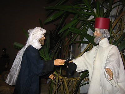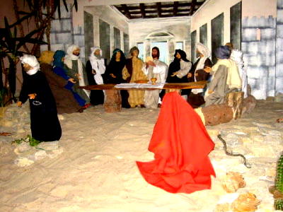 gehandelt habe.  Unsere Krippe: Die Szene des Abendmahls steht in manchen Jahren anstelle der Szene im Garten Getsemani und ist dann auch über die Ostertage zu sehen, da wir im Abendmahl sozusagen „komprimiert" das ganze Passions- und Ostergeheimnis, und damit die „Mitte unseres Glaubens" feiern - und das täglich und insbesondere an jedem Sonntag, dem wöchentlichen Gedächtnistag der Auferstehung Jesu. Den Hintergrund der Abendmahlsszene bildet der Abendmahlsraum, wie Leonardo da Vinci ihn sich vorgestellt und in dem wohl berühmtesten Abendmahlsbild gemalt hat. Um den Tisch sind wie bei Leonardo die zwölf Apostel um Jesus versammelt - oder genauer: Nur noch elf. Denn Judas hat bereits die Gemeinschaft verlassen. Schwarz gewandet ist er auf dem Weg zu den Hohenpriestern und Ältesten des Volkes, um Jesus auszuliefern. In der Hand trägt er den Beutel mit den 30 Silberlingen, die wir bis heute den „Judaslohn" nennen. Er wird von zwei Soldaten in Empfang genommen. Wer genau hinschaut, entdeckt, daß Judas einen Palmzweig vom jubelnden Einzug in Jerusalem „mit Füßen tritt": Das „Hosianna" ist überholt. Es wird nicht mehr lange dauern, bis das „Kreuzige ihn" die Oberhand gewinnt. Unterdessen bricht Jesus am Tisch für seine Freunde das Brot: „Das ist mein Leib." Und dann wird er auch den „Segenskelch" in die Hand nehmen und sagen: „Das ist mein Blut, das Blut des Bundes, das für viele vergossen wird zur Vergebung der Sünden." Obwohl die Evangelien nichts darüber berichten, sind doch