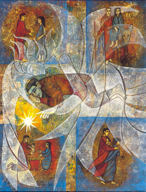 | La Lectura profética cuenta: En una época de gran opresión del pueblo de Israel Dios alentó a Acaz, Rey de Israel: “¡Conserva la serenidad, no temas!” E Isaías añade la misteriosa promesa de Dios: “El Señor os dará una señal: Ved que una joven concebirá un niño, alumbrará un hijo, y le dará por nombre Enmanuel (Dios con nosotros). El Evangelio del cuarto domingo de Adviento narra luego la historia de Navidad desde el punto de vista de José. La combinación de ambos textos bíblicos sugiere: El signo prometido a Acaz se dará verdaderamente a José. Es comprensible que él en principio no entendiese sino que “decidiese separarse de su prometida.” Pero después se convierten en “signo” para él en un sueño o –mejor - poco a poco en varios sueños todos los acontecimientos sobre el nacimiento de Jesús. La artista Beate Heinen ha retenido este proceso de comprensión creciente en una imagen navideña de gran sensibilidad:  Beate Heinen ha pintado a José como “el que sueña”. El ángel envuelve muy dulcemente con sus alas al durmiente José- como si le quisiera manifestar el tierno amor de Dios y protegerle de los apremiantes peligros. Al mismo tiempo le señala con la mano derecha la “estrella de Bethlehem”. Esta estrella muy luminosa, que también conduce a los magos de Oriente hacia Bethlehem, garantiza el misterio de la Encarnación de Dios, que José admite ante los magos. Beate Heinen agrupa alrededor de José las decisivas escenas del Nacimiento de Jesús, en las que José juega un papel clave: - Con los brazos abiertos acepta José a su joven esposa. - Hace con ella el camino hacia Bethlehem. - Allí experimenta con ella el acontecimiento del Nacimiento en el establo. - Y finalmente huye con ella y con el Niño hacia Egipto. Los sueños también pueden ser signos: Poniendo al día y también interpretando situaciones de la propia vida acumuladas en el subconsciente, abren perspectivas para el futuro y para la acción y así se convierten en “signos”. Un sueño puede también poner en relación “signos” que transmite la fe para la propia vida: Por ejemplo, el “ángel” o también la “estrella”, es decir, en general la luz. Estas experiencias oníricas probablemente las hemos tenido muchos de nosotros a veces. La artista en su imagen de Navidad alrededor de la figura de José esboza, por así decirlo, una Cruz como elemento estructural por medio de toda la imagen. Y, en verdad la Cruz, forma parte irrevocable del tiempo de Adviento y de Navidad. No es por casualidad que los pintores medievales le hayan dado a la Cruz un lugar en el pesebre. Anímense a contemplar ambos: La Cruz atraviesa esta parte de la vida de José y, al mismo tiempo, el cariñoso amor de Dios, en el que él permanece oculto en todo lo que sucede. Y descubran con los ojos abiertos y sentido de la fe todos los muchos “signos”, que en este tiempo de Adviento y Navidad señalan la presencia de Dios aquí en este mundo y en nuestra vida. En Su Encarnación en medio de nosotros y después en los magníficos signos de Su vida humana, que manifiestan Su gloria y, al mismo tiempo, Su amorosa proximidad. Amén www.heribert-graab.de www.vacarparacon-siderar.es |