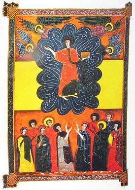 | Vendrá con las nubes (Manuscrito Facundo 1447, norte de España)  En la Sagrada escritura más bien se describen visiones, en las que el “Hijo del Hombre” viene “sobre las nubes” o “en una nube”. Ya en el último domingo, en la Fiesta de Cristo Rey, nos encontrábamos dos veces con este motivo en las lecturas: En la visión de Daniel: “Llegó con las nubes del cielo, uno como un hijo de hombre.” Después en la visión de Juan del Apocalipsis: “Ved que Él viene con las nubes y todo ojo le verá.” Hoy vuelve el Evangelio otra vez sobre este asunto: “Entonces se verá venir al Hijo del Hombre sobre una nube con gran poder y majestad.” Yo quisiera invitarles a contemplar conmigo este asunto según una ilustración medieval del monje Facundus: Cristo se manifiesta desde una nube. Es importante conocer el significado simbólico que se da a la nube en el lenguaje iconográfico de la Sagrada Escritura. Quizás ustedes recuerden el final de la Alianza de Dios con Israel: “Al tercer día, al rayar el alba, hubo truenos y relámpagos. Había densas nubes sobre el monte y un poderoso resonar de trompetas…” Y Dios hablaba a Moisés desde la nube y en el trueno. (Ex 19,16 ss) Cuando, bajo el Rey Salomón, estuvo terminado el Templo sobre el Sión y el Arca de la Alianza del Señor era llevada al Sancta Sanctorum, “una nube llenaba la Casa del Señor. Los sacerdotes no pudieron continuar el servicio a causa de la nube, porque la gloria del Señor llenaba la Casa del Señor.” (1 Re 8,10 s) También el Nuevo Testamento adopta este lenguaje iconográfico: En la Ascensión de Jesús “Él fue elevado ante los Apóstoles y una nube Le ocultó a sus ojos.” (Hch 1,9) Por consiguiente, Él fue elevado a la gloria de Dios. También en Su gloria divina Él aparece –visible para ellos– “al final de los tiempos”. Las visiones escatológicas del libro de Daniel, del Apocalipsis y también del Evangelio de Lucas lo expresan. Y ciertamente esto pone en imagen el monje Facundus: Cristo aparece en una obscura nube, que Le envuelve como en una mandorla. Su túnica resplandece tan roja que da la impresión de como si Él saliese de la nube, como si estuviese vivo. Pero, al mismo tiempo, Él está pintado así, para que permanezca inherente a la nube. Llega “con las nubes”, que Le descubren y Le envuelven, que Le revelan y, al mismo tiempo, Le ocultan, que Le muestran a la tierra y, sin embargo, Le dejan en su lugar celestial. Cristo viene con los brazos muy abiertos. Su derecha señala ligeramente hacia arriba, hacia donde también se dirige Su rostro, hacia donde miran Sus ojos. Esta mirada respalda el movimiento del descenso, de la aparición: de la eternidad para la eternidad. “Mirad, Él viene con las nubes”. La aparición de Cristo con y en la nube es destacada por el intenso amarillo, que no sólo separa muy claramente al cielo de la tierra, sino que también permite ansiar una amplio y profundo espacio, del que procede esta aparición, de la eternidad de Dios. En la parte superior, en el rojo naranja del cielo, que concuerda cromáticamente con el color de la tierra, se elevan cuatro figuras de ángeles alados, con alas azul claro y azul obscuro, en las cuales se ven ojos. Un nimbo amarillo oro resplandece a su alrededor. Ellos proceden del santo e inaccesible mundo de Dios, desde el que acontece este advenimiento. También parece que salen de la nube- como Cristo, que pertenece totalmente a ella. Pero inducen a error como también la nube, a la que retirasen- como un ropaje, para mostrar lo que si no estaría oculto. Experimentamos la manifestación de Jesús. Facundo pinta una simetría, elige este medio estilístico para un contenido imaginativo teológico. A la esfera celestial corresponde la terrenal, a las figuras de los ángeles alados, suspendidos, las diez figuras humanas erguidas. Estas diez figuras responden de “todos”, los que Le verán, cuando Él venga. Con los ojos muy abiertos miran la aparición. Las manos en la posición de batir palmas como quisieran recibir a Cristo. Estas personas están muy abiertas para aquel que viene. Una espera ansiosa se hace visible, una complacencia, preparación y asombro. La nube actúa como una resaca sobre el mundo. Su irrupción es como una apertura de su taciturnidad. Y estas diez personas esperan al Cristo que volverá, para recibirle en su círculo. Llevan el nimbo, con el que son señalados como aquellos, cuyos nombres están escritos en el libro de la Vida. Con ello quizás se indica ya el final del Apocalipsis de Juan: El alegre “Maranatha”, “Ven, Señor Jesús” (Ap, 22,20). Amén. |