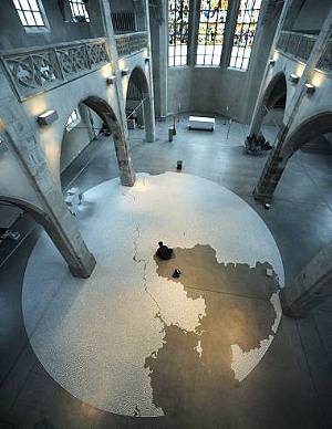 El laberinto es un antiguo símbolo del camino pascual, de la obscuridad de la muerte a la luz. En este sentido tiene su origen en la época precristiana, en la leyenda griega de la victoriosa lucha de Teseo contra el mortífero Minotauro. El Rey Minos de Creta había vencido a Atenas en la guerra. Él exigió, por así decirlo, como “tributo de reparación” de Atenas un joven patricio cada año, que era enviado como víctima de reconciliación a la cueva laberíntica del monstruo. Y hasta entonces nadie había escapado vivo de este laberinto mortal. Un año le cayó en suerte a Teseo, que fue enviado a Creta acto seguido. Pero antes de que tomase el camino hacia la muerte segura, se había enamorado de él Ariadna, la hija del Rey de Creta. Ella estaba convencida de que él podría vencer al Minotauro y le dio un ovillo de hilo rojo para el camino. Éste le debía ayudar a volver a encontrar el camino hacia la luz de la vida a través de la obscuridad de la muerte. Por consiguiente, así descendió Teseo al laberinto, venció en su abismo –por consiguiente, en el centro de la obscuridad de la muerte– al Minotauro y ascendió de nuevo con la ayuda del hilo de Ariadna: De nuevo a la luz de la vida. Los primeros cristianos refirieron esta saga al Cristo pascual: “Descendió al reino de la muerte y al tercer día resucitó de entre los muertos.” Por lo tanto, el laberinto es un símbolo pascual para nuestro propio camino a través de la obscuridad de la muerte hacia la luz de la mañana de pascua.  En muchas catedrales góticas –sobre todo francesas– se halla el laberinto. El más famoso de todos es el laberinto de Chartres. En la Edad Media, el sacerdote “bailaba”, durante la liturgia de la noche pascual, en este laberinto un “baile litúrgico de resurrección”. Hoy, el laberinto como símbolo de la vida, vuelve a ser muy “moderno”: Se halla, en su significado cristiano, por ejemplo en los jardines de las Casas de Ejercicios, como símbolo cristiano o también exotérico en muchos parques públicos. Siempre es testigo de la búsqueda de los seres humanos de una vida realizada, del centro de la vida. El artista del gran Laberinto de Sal, aquí en nuestra iglesia, Motoy Yamamoto, no es cristiano, pero también para él, desde la muerte de su “hermana pequeña”, se trata de un enfrentamiento existencial con la muerte y la vida. En su patria, Japón, la sal es un ingrediente importante de los rituales fúnebres. Así comenzó Yamamoto a crear con sal objetos de búsqueda y de carácter transitorio. Continuamente captura en este enfrentamiento el motivo del laberinto. Su laberinto aquí entre nosotros se diferencia claramente del laberinto medieval de Chartres: Refleja un mundo que se ha vuelto esencialmente complicado. Además le falta el “centro” señalado por la fe. Pero su laberinto no es en absoluto un dédalo. Más bien copia los sinuosos caminos de la vida humana en un mundo desconcertante. Pero me llama la atención que Yamamoto -muy conscientemente- haya incluido el altar de cruces de Eduardo Chillida en su laberinto. Por una parte con ello tiende un puente formal entre estas dos obras de arte, del mismo modo que también efectúa una relación formal entre el Laberinto de Sal y el espacio eclesial del gótico medieval, en el que tenían su sitio los antiguos laberintos pascuales. Más allá de esto, yo estoy convencido de que él también ve los puntos de referencia en cuanto al contenido entre la Cruz de Jesucristo, el altar y nuestra vida, pero como una cuestión, por la que él también quiere preguntarse. Quizás a ustedes les haya llamado la atención que en algunos lugares hay “fracturas” que atraviesan el laberinto circular. Pueden recordarnos las “fracturas de nuestra vida”, por ejemplo, la “fractura” que ocasiona en cada caso la muerte de un ser querido. La “fractura” más grande se tuerce en su largo recorrido como un río a través del “paisaje” del laberinto y finalmente desemboca en un espacio vacío al borde del laberinto, como en un “delta”. Quizás este río se pueda asociar también con la “corriente de la vida”. Esta “corriente de la vida” captaría y reconduciría otra vez -para nosotros como cristianos- el tema pascual de la vida. Contemplemos todavía el material, con el que el artista trabaja. La sal es también un símbolo cristiano: Así como la sal es vitalmente necesaria para los seres humanos, del mismo modo Cristo es necesario para una vida definitivamente realizada y consumada: “Yo soy el camino, la verdad y la vida. Nadie llega la Padre, si no es por Mí” (Jn 14,6) Por consiguiente, la sal refuerza el laberinto, como símbolo del camino hacia la Vida. Yamamoto trabaja con sal para transformar la muerte de su hermana. Pero ciertamente la sal puede ser también una ayuda, desde el punto de vista cristiano, para “aceptar” la muerte como resurrección a la Vida consumada. Pero sobre todo, Jesús mismo utiliza el símbolo de la sal: “Vosotros sois la sal de la tierra. Si la sal pierde su sabor ¿con qué se salará? Ya no sirve para nada; será tirada y la pisotearán las gentes.” (Mt 5,13) Según la tradición del Evangelio de Marcos, Él dice: “La sal es algo bueno; pero si la sal se vuelve insípida ¿con qué la sazonaréis? ¡Tened sal en vosotros mismos y mantened la paz unos con otros! (Mc 9,50; semejante Lc 14.34) Por consiguiente, como cristianos, hay que ser condimento en la “sopa” de este mundo, de modo que las personas y también los propios cristianos se “mojen” continuamente. La “sal” de una fe vivida en este mundo consigue, conforme a Jesús, aquella “paz que el mundo no puede dar.” (Jn 14,27) Por consiguiente, la expresión de Jesús sobre la “sal” es de rabiosa actualidad, bajo la consideración de aquella discordia y de todas las guerras que el mundo de la política, de la economía y también de la religión hace tan “incomestible”. Fina
