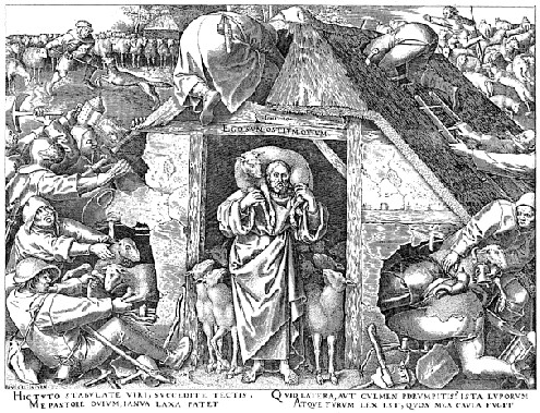 | Das Evangelium vom Guten Hirten – ein Oster-Evangelium? Das zu verstehen, dazu hilft der Psalm 23: Der Herr ist mein Hirte, nichts wird mir fehlen. Er läßt mich lagern auf grünen Auen und führt mich zum Ruheplatz am Wasser… Du deckst mir den Tisch vor den Augen meiner Feinde. Du salbst mein Haupt mit Öl, du füllst mir reichlich den Becher… Ps. 23, 1-2.5 Der Psalm verknüpft mit der Gestalt des Hirten Stichworte österlicher Lebensfülle: Grüne Auen, Ruheplatz am Wasser, der gedeckte Tisch, der reichlich gefüllte Becher. Stille Jesus selbst läßt schon in Seiner Bildrede vom Guten Hirten keinen Zweifel daran, daß der österlichen Botschaft vom Guten Hirten die Realität der Welt als Kontrast entgegensteht. Im Text des heutigen Evangeliums bildet der bezahlte Knecht, dem an den Schafen nichts liegt, den Kontrast. Ebenfalls im Johannes-Evangelium wenige Verse zuvor zeigt Jesus noch einen anderen Kontrast auf: „Wer in den Schafstall nicht durch die Tür hineingeht, sondern anderswo einsteigt, der ist ein Dieb und ein Räuber.“ (Joh.10,1)  Beide Kontraste hat Pieter Breughel dargestellt: Im Hintergrund links der „Gute Hirt“, der den Wolf abwehrt; im Hintergrund rechts der „bezahlte Knecht“, der flieht. Im Vordergrund all die Diebe und Räuber, die stehlen und rauben. Jesus bezieht die Hirtenrede auf sich selbst und auf Seine Reich-Gottes-Botschaft im Kontrast zu den Führern des Volkes zu Seiner Zeit. Aktuell gibt es natürlich Bezüge zur Realität heute, und zwar in vielen Lebensbereichen, und nicht zuletzt auch Bezüge zu uns ganz persönlich. Stille Auf eine sehr polemische Art und Weise wurde die Hirtenrede Jesu während der Reformationszeit in Flugblättern aktualisiert:  Dieses Flugblatt zeichnet den Papst, die Bischöfe und die Mönche als Diebe, Räuber und bezahlte Knechte. Nicht weniger derb und polemisch war die damalige „Öffentlichkeitsarbeit“ auch auf katholischer Seite. In der Ökumene unserer Zeit haben wir diesen üblen Stil der Auseinandersetzung Gott-sei-Dank überwunden. Aber selbstverständlich hat die Hirtenrede Jesu auch heute einen aktuellen Bezug zur Kirche Jesu Christi. Wenn wir darüber nachdenken, sollte uns als Erstes vor Augen stehen, daß wir selbst Kirche sind! Stille Lassen Sie uns abschließend diese Hirtenrede noch bedenken im Blick auf alle - auch privaten - Lebensbereiche, in denen wir selbst Verantwortung tragen: dazu gehören nicht nur Politik, Kirche und Gesllschaft; dazu gehören ebenso die Bereiche von Familie, von Freundschaft und Nachbarschaft, und nicht zuletzt der ganze berufliche Lebensbereich. Bitte versuchen Sie in einer letzten Zeit der Stille vor allem den Breughel-Stich noch einmal neu zu sehen unter dieser ganz persönlichen Rücksicht der eigenen Verantwortung im Miteinander der Menschen Ihres ganz persönlichen Umfeldes. Stille |