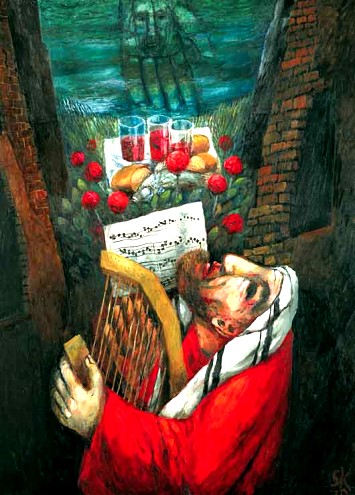 begleitet seinen eigenen dankerfüllten Gesang auf der Harfe,